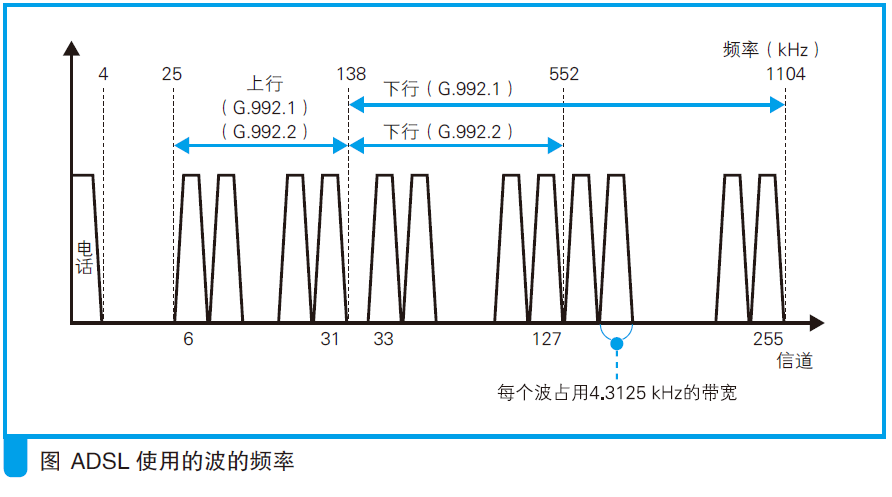ADSL 技术中,上行方向(用户到互联网)和下行方向(互联网到用户)的传输速率是不同的,原因也在这里。如果上行使用 26 个频段,下行则可以使用 95 个或者 223 个频段,波的数量不同,导致了上下行速率