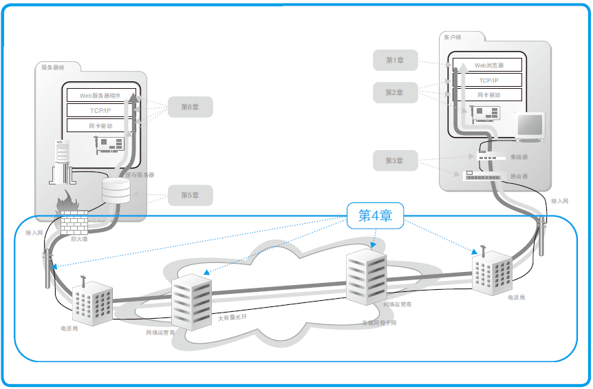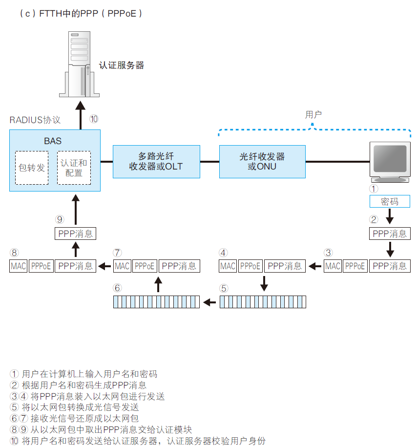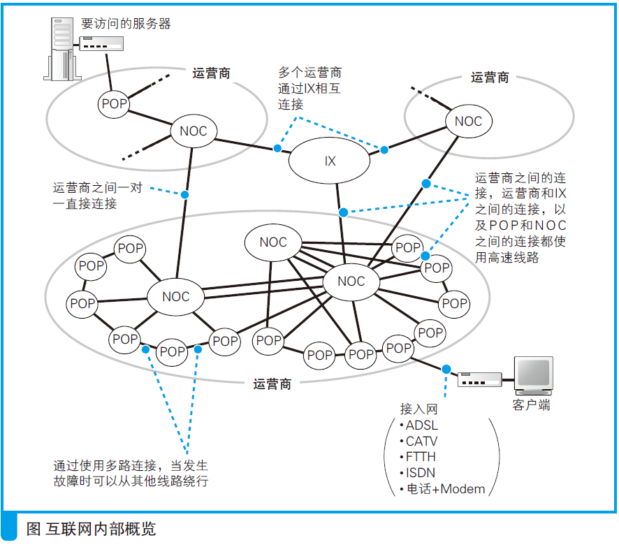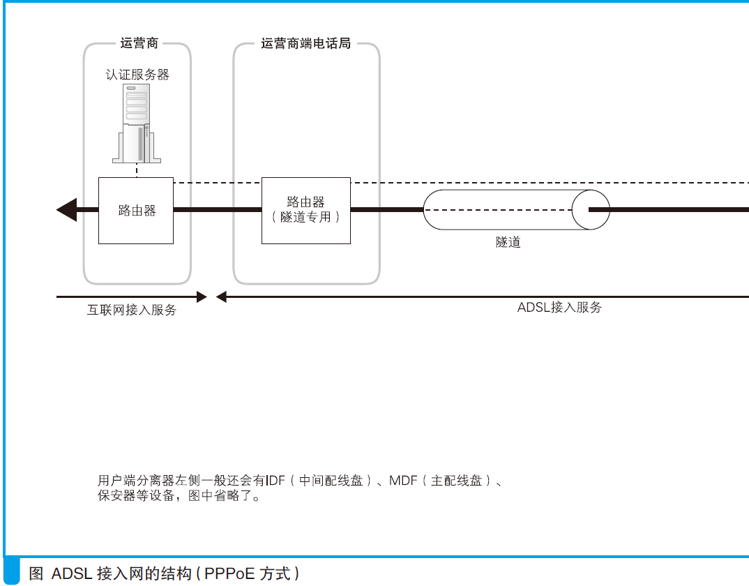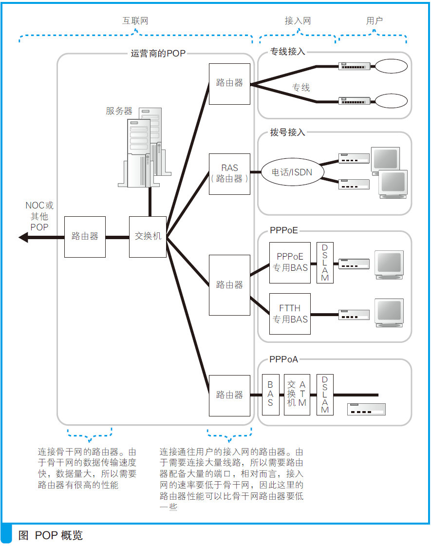 介绍了 ADSL 和 FTTH 两种接入网的结构和功能以及相应的 PPP、PPPoE、PPPoA、DHCP 等通信协议,还介绍了运营商内部的 POP、NOC 和 IX 的功能和作用。