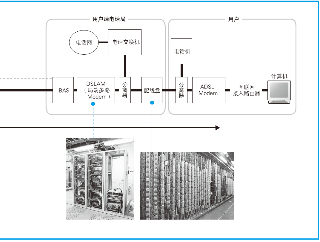 信号通过电话线到达电话局之后,会经过配线盘、分离器到达 DSLAM(⑨)。在这里,电信号会被还原成数字信息——信元(⑩)。