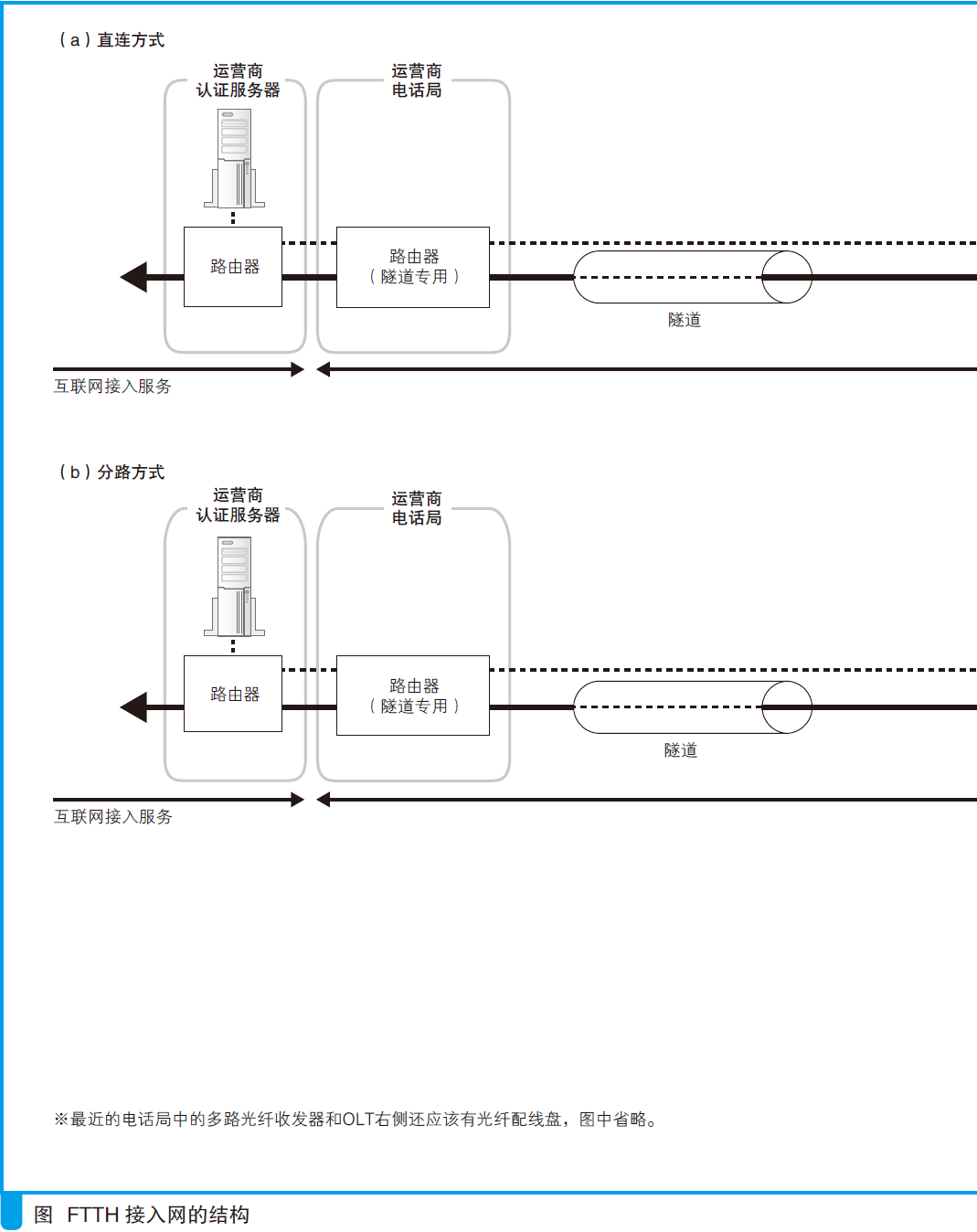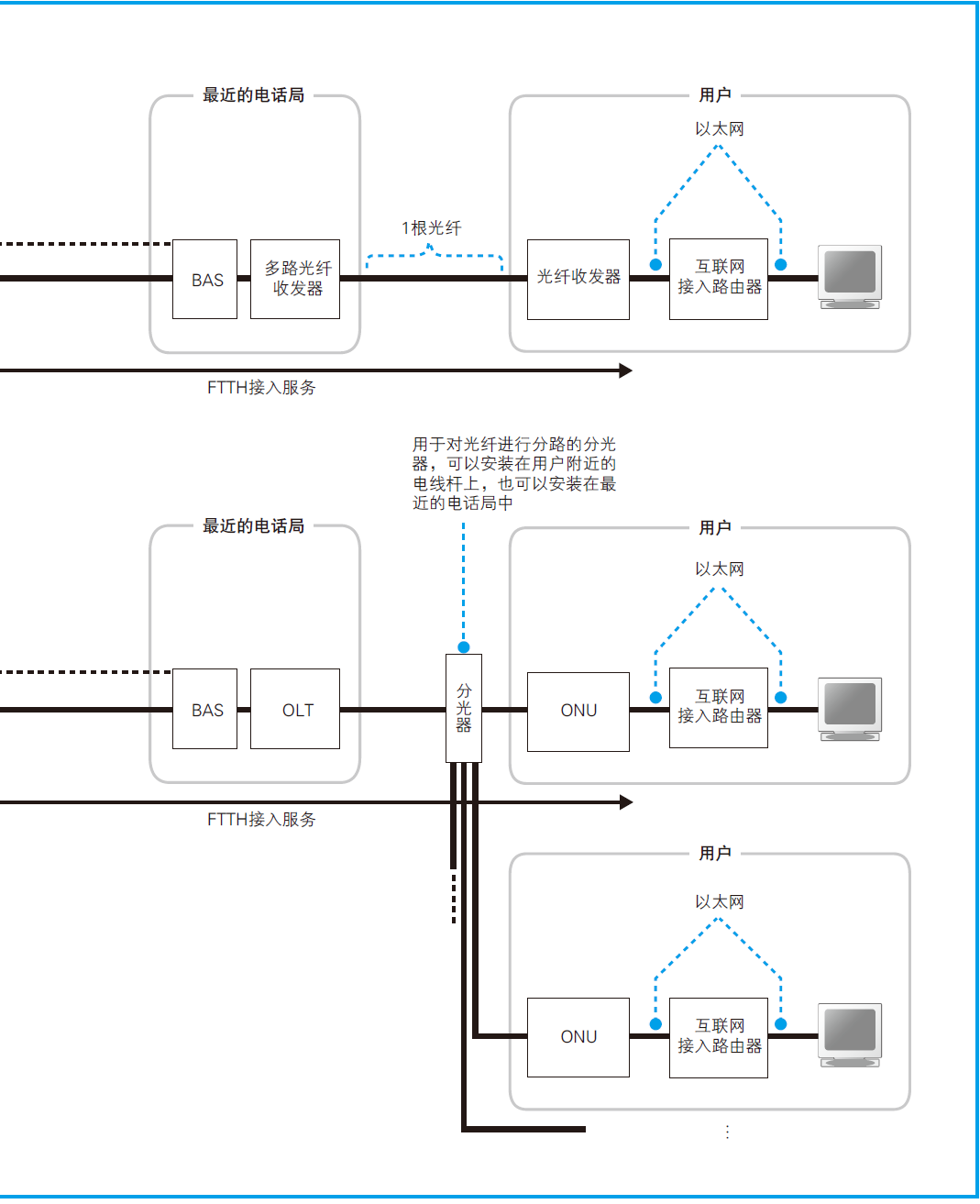 一种是用一根光纤直接从用户端连接到最近的电话局(如下图 a)。这种类型的 FTTH 中,用户和电话局之间通过光纤直接连接,网络包的传输方式如下。首先,用户端的光纤收发器将以太网的电信号转换成光信号。这一步只进行电信号到光信号的转换,而不会像 ADSL 一样还需要将包拆分成信元,大家可以认为是将以太网包原原本本地转换成了光信号。接下来,光信号通过连接到光纤收发器的光纤直接到达 BAS 前面的多路光纤收发器。FTTH 一般使用单模光纤,因此其纤芯中只有特定角度的光信号能够反射并前进。然后,多路光纤收发器将光信号转换成电信号,BAS 的端口接收之后,将包转发到互联网内部。