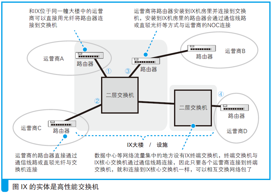 二层交换机 IX:这种方式称为“二层方式”,在日本是主流方式,当然,也有采用其他方式的 IX。