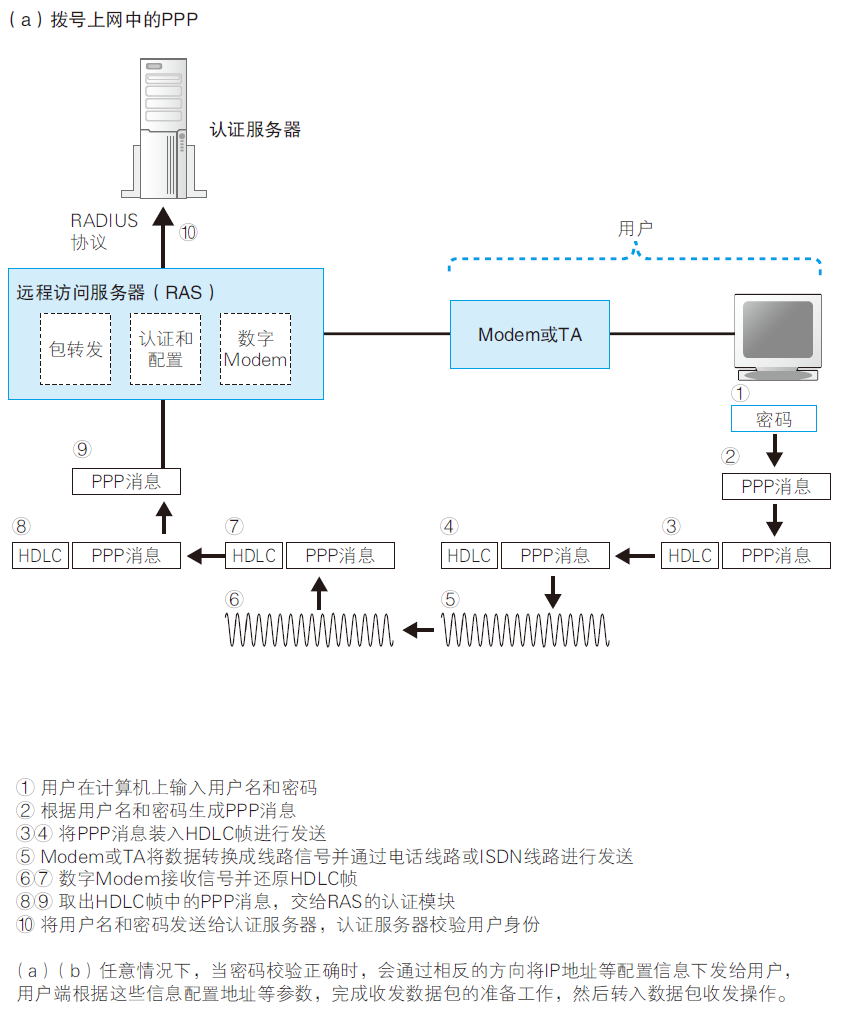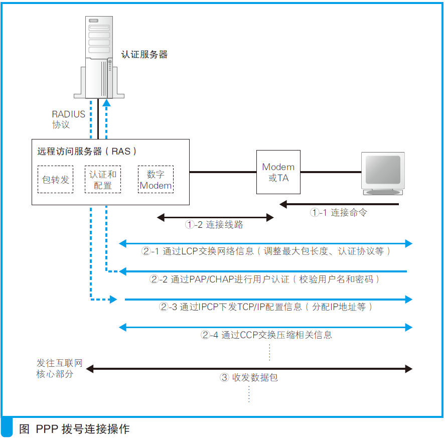 PPP:Point-to-Point Protocol,点到点协议。它是电话线、ISDN 等通信线路所使用的一种协议,集成了用户认证、配置下发、数据压缩、加密等各种功能。