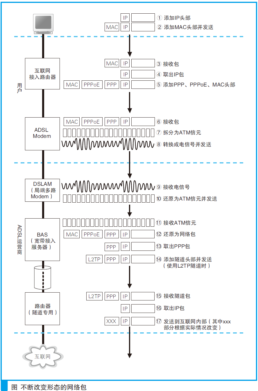 ADSL 技术使用的接入线路,其内部结构如下图所示,在这张图中网络包是从右往左传输的。用户端路由器发出的网络包通过 ADSL Modem(调制解调器) 和电话线到达电话局,然后到达 ADSL 的网络运营商(即 ISP,互联网服务提供商)。在网络包从用户传输到运营商的过程中,会变换几种不同的形态。