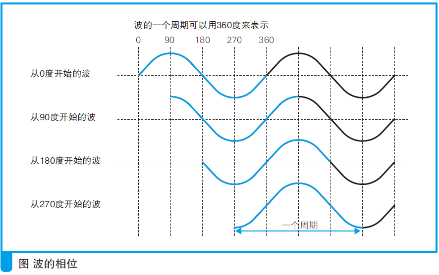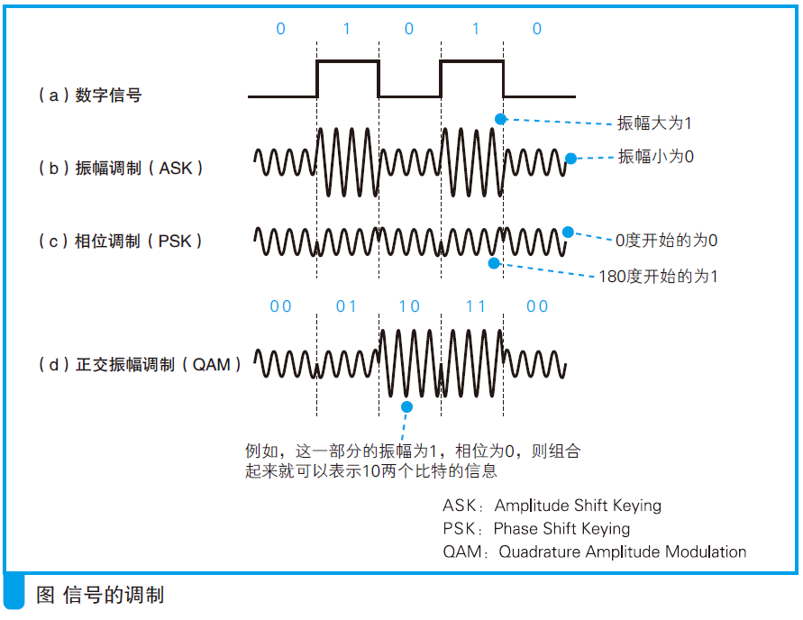 个圆,则起始位置就可以用 0 度到 360 度的角度来表示,这个角度就是相位,用角度来对应 0 和 1 的方式就叫作相位调制。例如,从 0 度开始的波为 0,从 180 度开始的波为 1,这是一种最简单的对应关系,如图如上图(c)所示。和振幅调制一样,相位调制也可以通过将角度划分为更细的级别来增加对应的比特数量,从而提高速率。但是,角度太接近的时候也容易产生误判,因此这样提升速率还是有限度的。