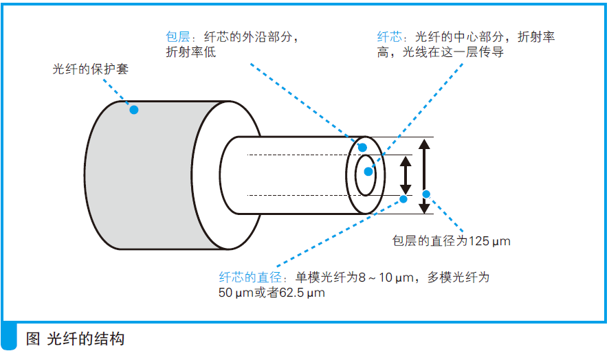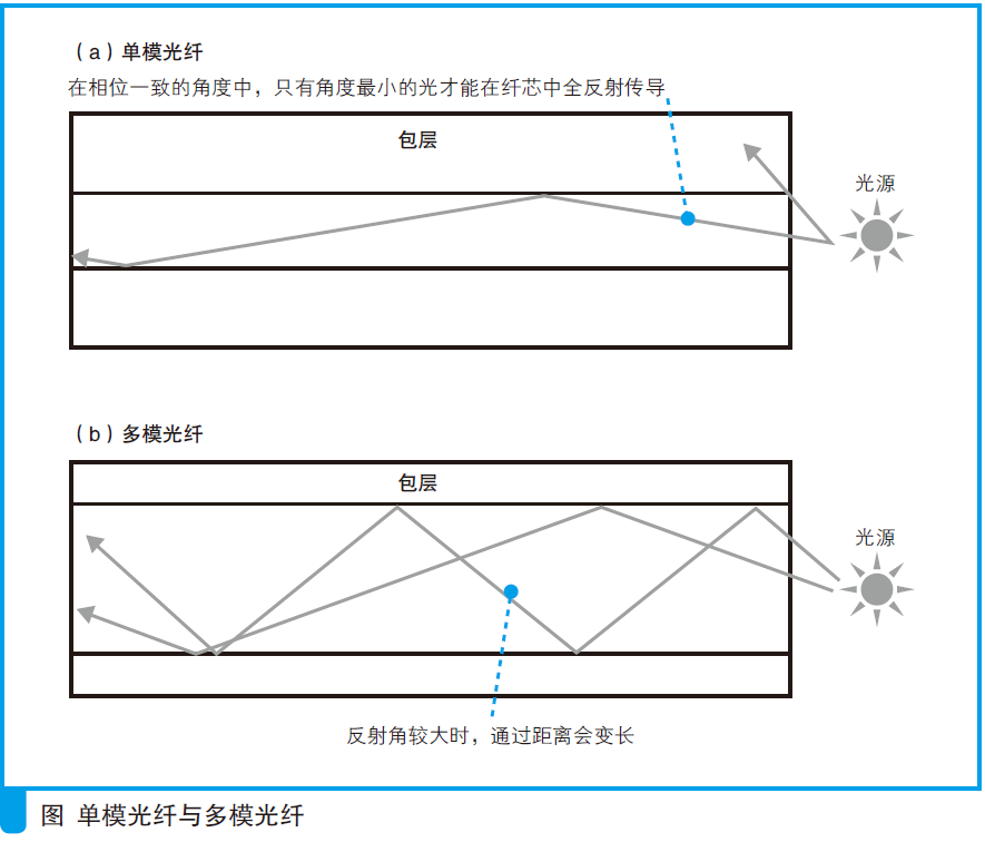 (50 μm 或 62.5 μm)。单模光纤的纤芯很细,只有入射角很小的光线才能进入,因此在能够保持相位一致的角度中,只有角度最小的光线能进入光纤。反过来可以说,单模光纤的纤芯直径就是按照只允许相位一致的最小角度的光进入而设计的。多模光纤的纤芯比较粗,入射角比较大的光也可以进入,这样一来,在相位一致的角度中,不仅角度最小的可以在光纤中传导,其他角度更大一些的也可以,也就是说,可以有多条光线在纤芯中同时传导。换句话说,单模和多模实际上表示相位一致的角度有一个还是多个。