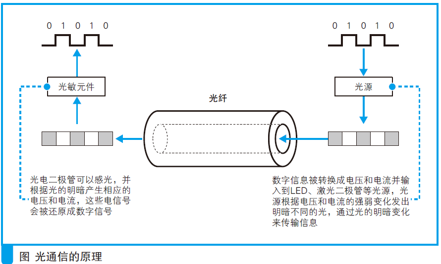 入 LED、激光二极管等光源后,这些光源就会根据信号电压的变化发光,高电压发光亮,低电压发光暗。这样的光信号在光纤中传导之后,就可以通过光纤到达接收端。接收端有可以感应光线的光敏元件,光敏元件可以根据光的亮度产生不同的电压。当光信号照射到上面时,光亮的时候就产生高电压,光暗的时候就产生低电压,这样就将光信号转换成了电信号。最后再将电信号转换成数字信息,我们就接收到数据了。