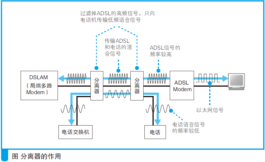 分离器的作用其实在相反的方向,也就是信号从电话线传入的时候。这时,分离器需要负责将电话和 ADSL 的信号进行分离(如下图)。电话线传入的信号是电话的语音信号和 ADSL 信号混合在一起的,如果这个混合信号直接进入电话机,ADSL 信号就会变成噪音,导致电话难以听清。为了避免这样的问题,就需要通过分离器将传入的信号分离,以确保 ADSL 信号不会传入电话机。具体来说,分离器的功能是将一定频率以上的信号过滤掉,也就是过滤掉了 ADSL 使用的高频信号,这样一来,只有电话信号才会传入电话机,但对于另一头的 ADSL Modem,则是传输原本的混合信号给它。ADSL Modem 内部已经具备将 ADSL 频率外的信号过滤掉的功能,因此不需要在分离器进行过滤。