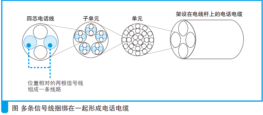 接下来,信号会进入电线杆上架设的电话电缆。电话线是一种直径 0.32~0.9 mm 的金属信号线,这些信号线如下图所示被捆绑在一起。