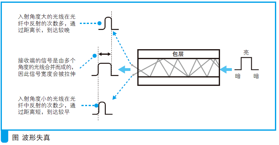 信号失真与光在纤芯传导时反射的次数相关。多模光纤中,多条反射角不同的光线同时传导,其中反射角越大的光线反射次数越多,走过的距离也就越长;相对地,反射角越小的光线走过的距离越短。光通过的距离