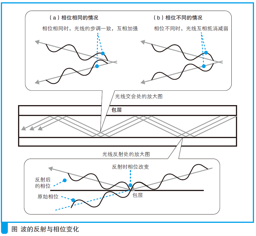 不过,也不是所有入射角小的光线都会在纤芯中传导。光也是一种波,因此光也有相位属性,当光线在纤芯和包层的边界上反射时,会由于反射角产生相位变化。当朝反射面前进的光线和被反射回来的光线交会时,如果两条光线的相位不一致,就会彼此发生干涉抵消,只有那些相位一致的光线才会继续在光纤中传导。