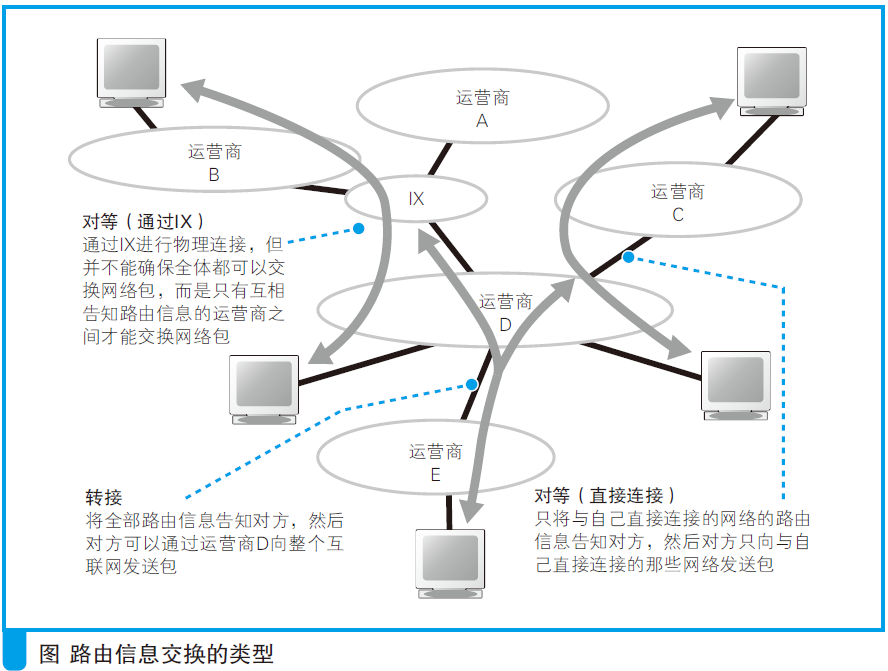 转发,也就是说,仅仅用线路将路由器连起来,是无法完成包转发的。下面我们来看看运营商之间是如何交换路由信息,并对路由器进行自动更新的。