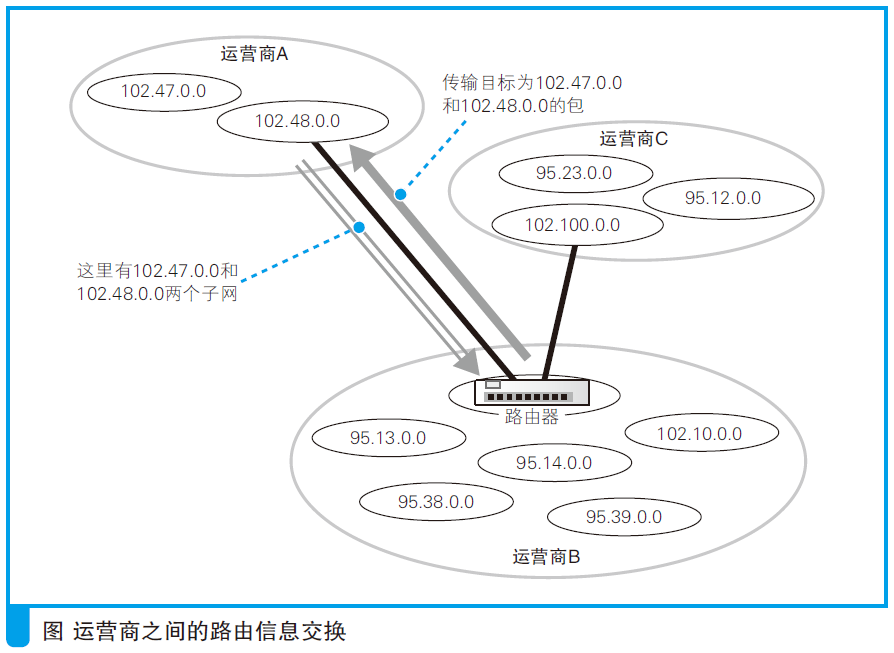 运营商之间需要对交换路由信息的对象进行判断和筛选,但这样一来,对于没有交换路由信息的运营商网络,我们就无法将网络包发送过去了,如果要访问的 Web 服务器就在那个运营商网络中,我们不就访问不了了吗?其实不用担心,运营商在进行路由交换时会避免出现这样的情况。互联网中有很多运营商,每个运营商都和其他多个运营商相互连接。因此,如果一个运营商走不过去,可以走另一个运营商,无论网络包要发送到什么地方,都会确保能够获取相应的路由信息。如果某个运营商做不到这一点,那它也就该倒闭了。