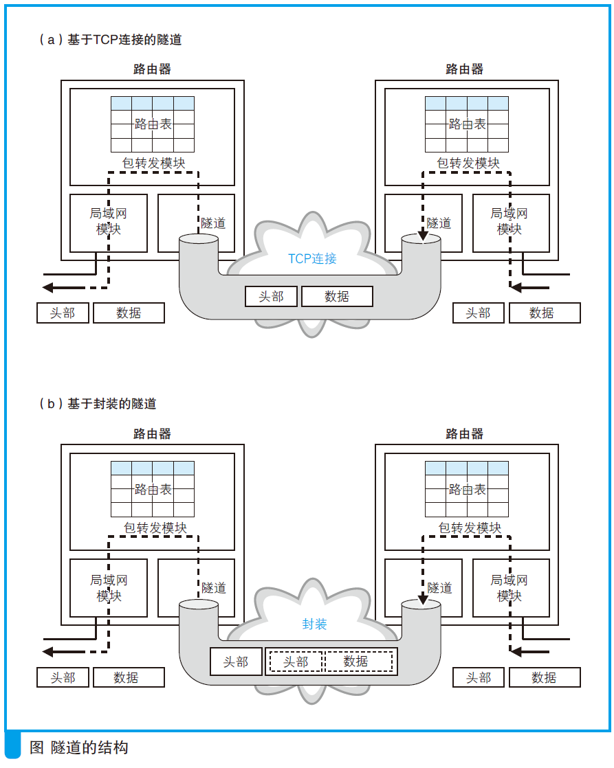 然后,网络包会到达隧道出口的隧道专用路由器(⑮),在这里隧道头部会被去掉,IP 包会被取出(⑯),并被转发到互联网内部(⑰)。